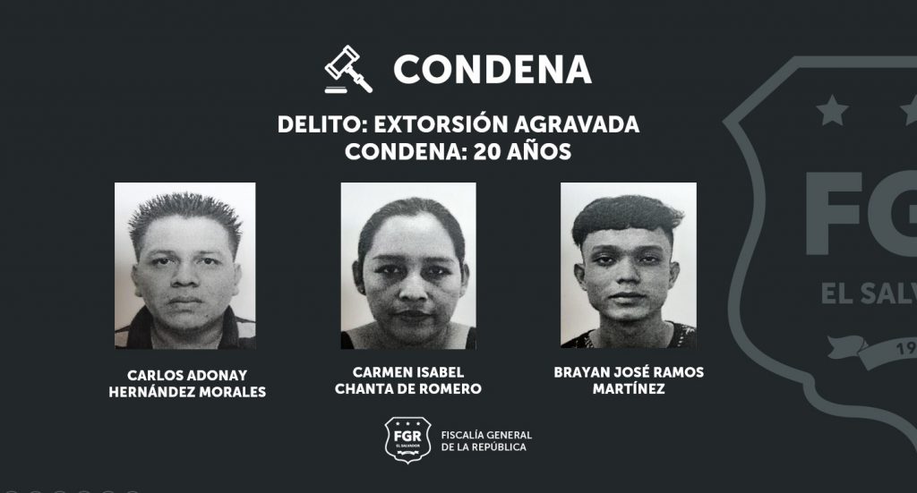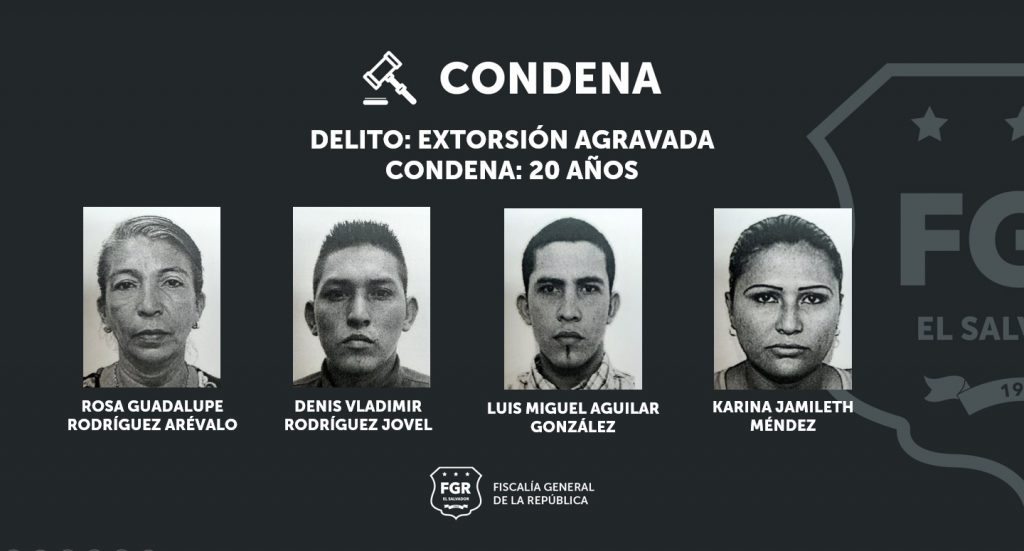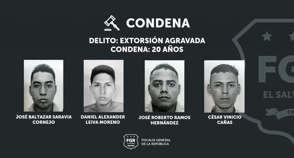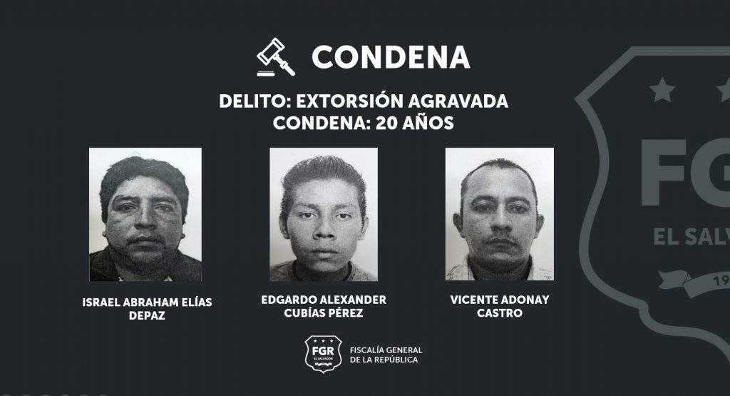 El Tribunal Primero de Sentencia de Zacatecoluca avaló todas las pericias indagatorias presentadas por los fiscales, quienes lograron demostrar la participación delictiva de cada imputado en los hechos acusados, por lo que ha decidido imponerle la pena máxima establecida para el delito de extorsión.