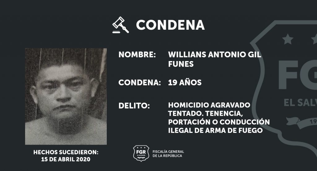 Los sentenciados responden a los nombres de: Willians Antonio Gil Funes, condenado a 19 años de cárcel por los dos delitos en mención y Carlos Ovidio García Vásquez fue sentenciado a 15 años en prisión solo por el homicidio tentado.