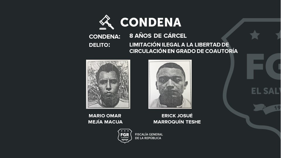Sonsonate. La Fiscalía logró una sentencia de prisión para Erick Josué Marroquín Teshe alias “barney” y Mario Omar Mejía Macua alias “toto”, quienes interceptaron a su víctima y le amenazaron de quitarle la vida a él y su familia si no abandonaban la zona donde residían.