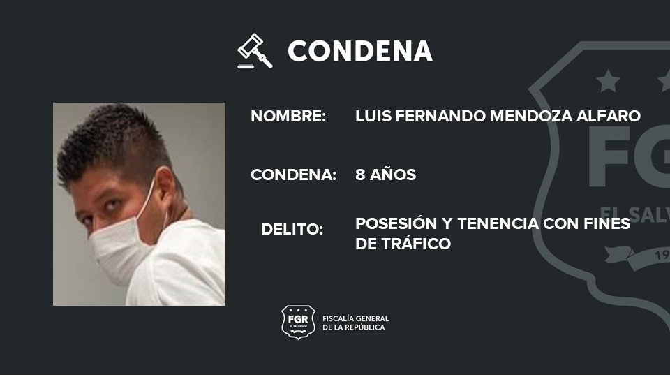 Santa Tecla. Luis Fernando Alfaro Mendoza, alias “Gato”, fue condenado a ocho años de cárcel por tráfico de drogas. El hecho sucedió el 4 de febrero del 2022 en Santa Tecla, La Libertad.