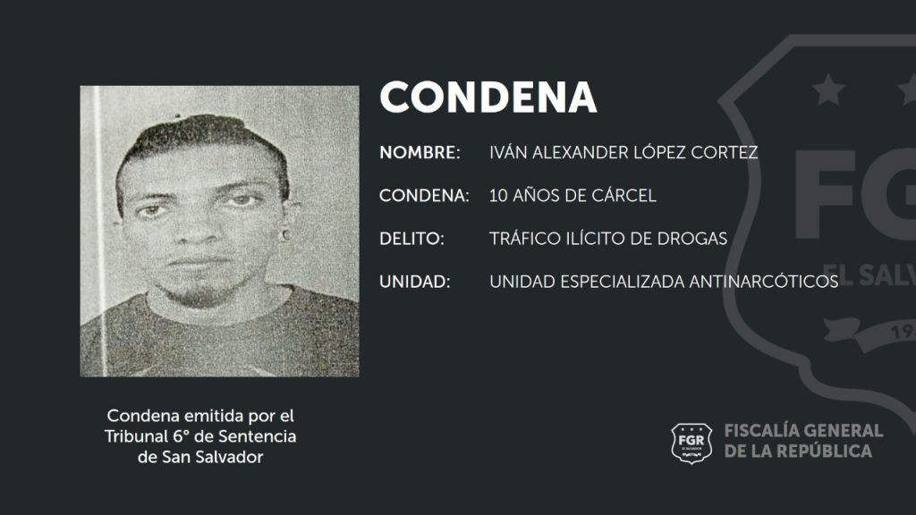 San Salvador. La Unidad Especializada de Delitos de Narcotráfico de la Fiscalía General de la República logró una condena de 10 años de cárcel para Iván Alexander López Cortéz, por el delito de Tráfico Ilícito de Drogas en perjuicio de la Salud Pública.