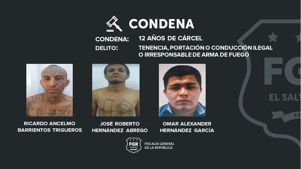 Santa Ana. La Fiscalía logró que se impusiera una condena de 12 años de cárcel para Ricardo Ancelmo Barrientos Trigueros, José Roberto Hernández Abrego y Omar Alexander Hernández García por el delito tenencia, portación o conducción ilegal o irresponsable de arma de fuego.