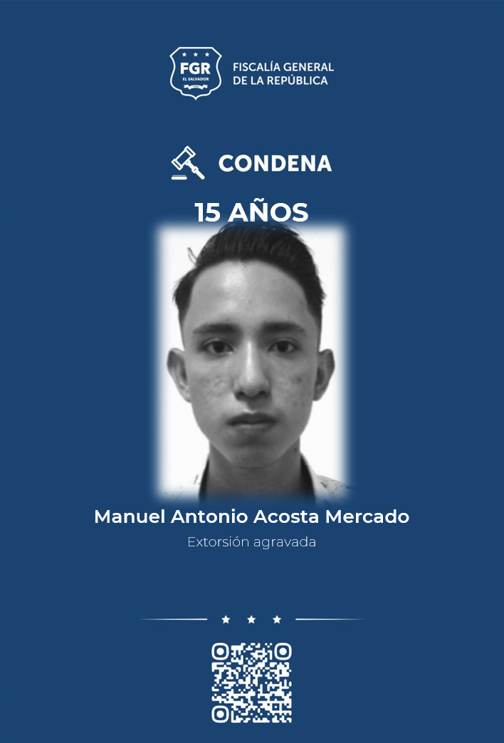 Apopa, San Salvador Oeste. Dennis Nehemías Carrillo Mejía, alias Gordo; Manuel Antonio Acosta Mercado, alias Manuel, y César Enrique Rivera Rivas, alias Kike fueron condenados a 15 años de prisión por el delito de extorsión agravada. Todos imputados estuvieron presentes en el juicio y son miembros de la pandilla Barrio 18 revolucionarios.