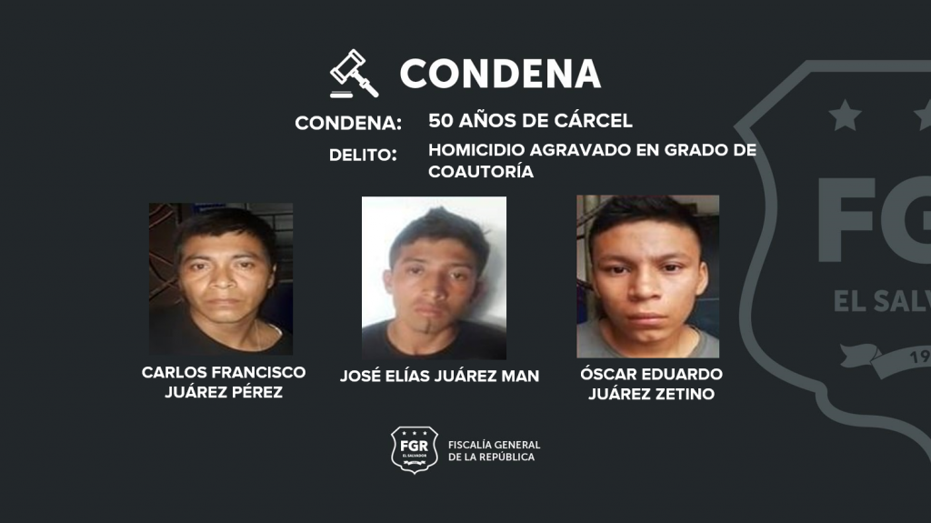 Sonsonate. La Fiscalía General de la República llevó a juicio a los tres imputados identificados como Carlos Francisco Juárez Pérez, José Elías Juárez Man y Óscar Eduardo Juárez Zetino, quienes fueron condenados a 50 años de cárcel por el delito de homicidio agravado en grado de coautoría con abuso de superioridad en perjuicio de un elemento de la Fuerza Armada.