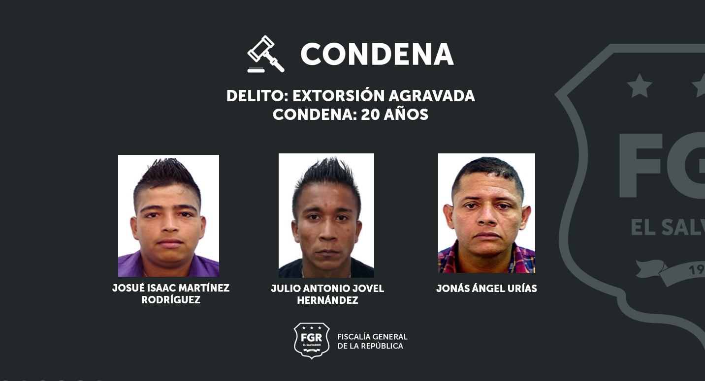 San Vicente. Tres peligrosos pandilleros han sido condenados a 20 años de prisión, por el delito de extorsión agravada, gracias a las sólidas pruebas presentadas por los fiscales en el juicio contra Julio Antonio Jovel Hernández, Josué Isaac Martínez Rodríguez y Jonás Ángel Urías. Todos miembros activos de la pandilla Barrio 18 revolucionarios.