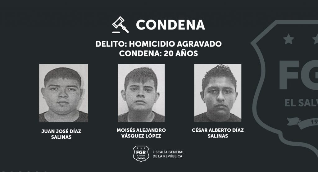 Zacatecoluca, La Paz. Luego de tres días de juicio, los fiscales lograron condenar a tres peligrosos terroristas por el delito de homicidio agravado. Los imputados fueron identificados como: Juan José Díaz Salinas, Moisés Alejandro Vásquez López y César Alberto Días Salinas, todos miembros de la Mara Salvatrucha, MS-13.