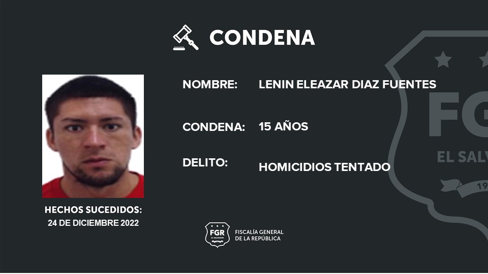 Chalatenango. Lenin Eleazar Diaz Fuentes fue condenado a 15 años de prisión por haber intentado asesinar a 2 personas con un cuchillo. Según las investigaciones fiscales, el 24 de diciembre de 2022 las víctimas departían en el cantón La Junta, municipio de Comalapa, Chalatenango, cuando fueron atacadas.
