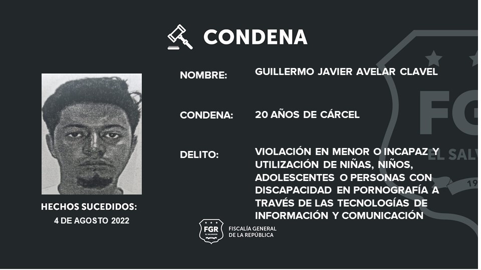 Chalatenango. A 20 años de prisión fue condenado Guillermo Javier Avelar Clavel por los delitos de violación en menor o incapaz, y utilización de niñas, niños, adolescentes o personas con discapacidad en pornografía a través de las tecnologías de la información y la comunicación.