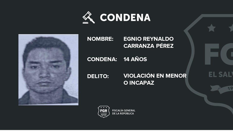 Santa Ana. Una sentencia de prisión de 14 años fue impuesta a Egnio Reynaldo Carranza Pérez, a quien la Fiscalía acusó de Violación en Menor o Incapaz y comprobó con pruebas su culpabilidad.