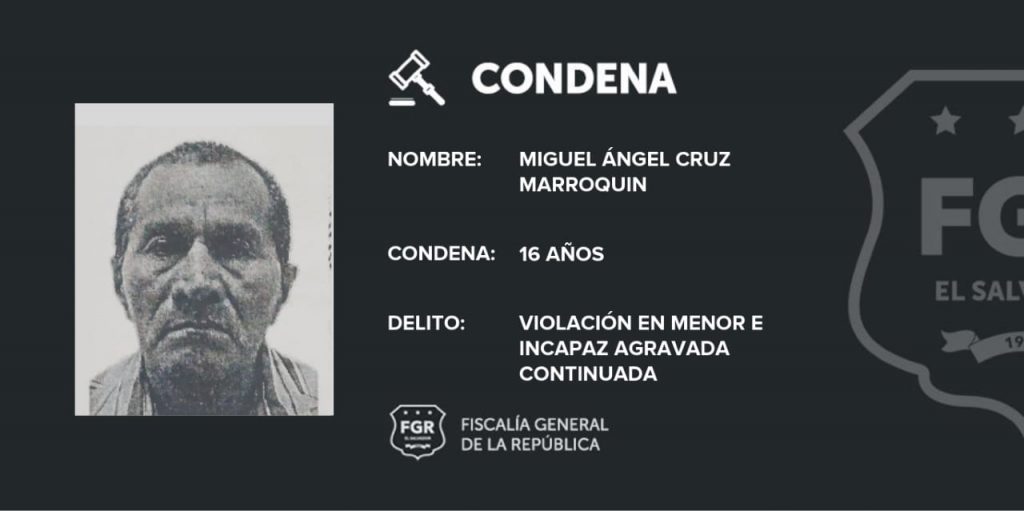San Salvador. Fiscales de la Unidad de Atención Especializada para la Mujer, Niñez y Adolescencia (UAEMNA) -de la sede en Cojutepeque- hicieron posible que el Tribunal Quinto de Sentencia de San Salvador condenara a 16 años de cárcel a Miguel Ángel Cruz Marroquín, por el delito de Violación en Menor e Incapaz Agravada Continuada, en perjuicio de una menor de 13 años.