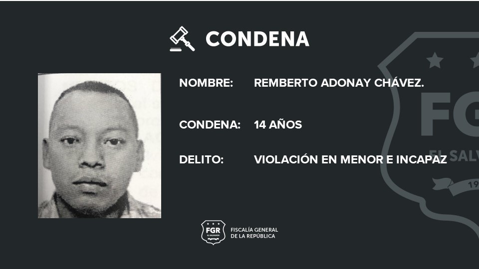 Santa Ana. Remberto Adonay Chávez fue condenado a 14 años de cárcel por haber resultado culpable de haber violado a una menor de edad. El abuso se cometió en el año 2005, en el municipio de Candelaria de la Frontera, departamento de Santa Ana.