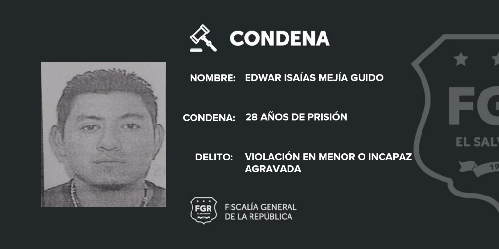 Cojutepeque, Cuscatlán. La Unidad de Atención Especializada para la Mujer, Niñez y Adolescencia de la Oficina Fiscal de Cojutepeque logró condenar a Edwar Isaías Mejía Guido a 28 años de prisión por el delito de Violación Agravada en Menor en perjuicio de dos víctimas.