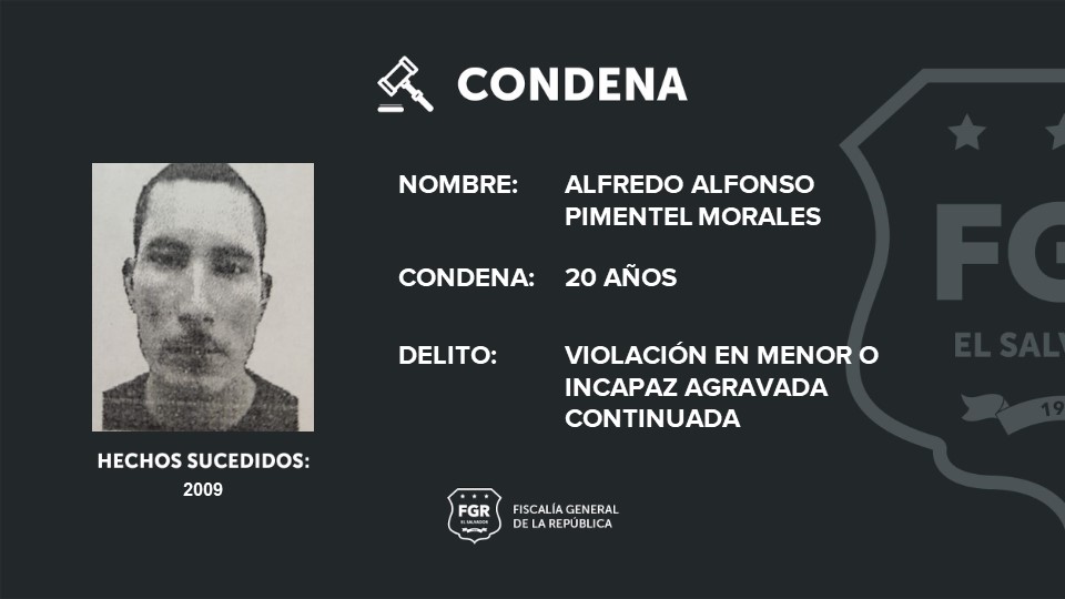 Ahuachapán. Alfredo Alfonso Pimentel Morales fue sentenciado a 20 años de prisión, luego que la Fiscalía comprobó en un juicio que el 8 de marzo de 2009, comenzó a abusar y luego violar a una menor de edad.