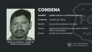Ahuachapán. La Fiscalía, a través de la Unidad de Atención Especializada para la Mujer, Niñez y Adolescencia de la sede en Ahuachapán, logró que Edwin Alberto Contreras Ábrego fuera condenado a 14 años de prisión por el delito de Violación Agravada en Menor o Incapaz, en perjuicio de una adolescente de 13 años, según explicó el jefe de esta sede Cristóbal Hernández.