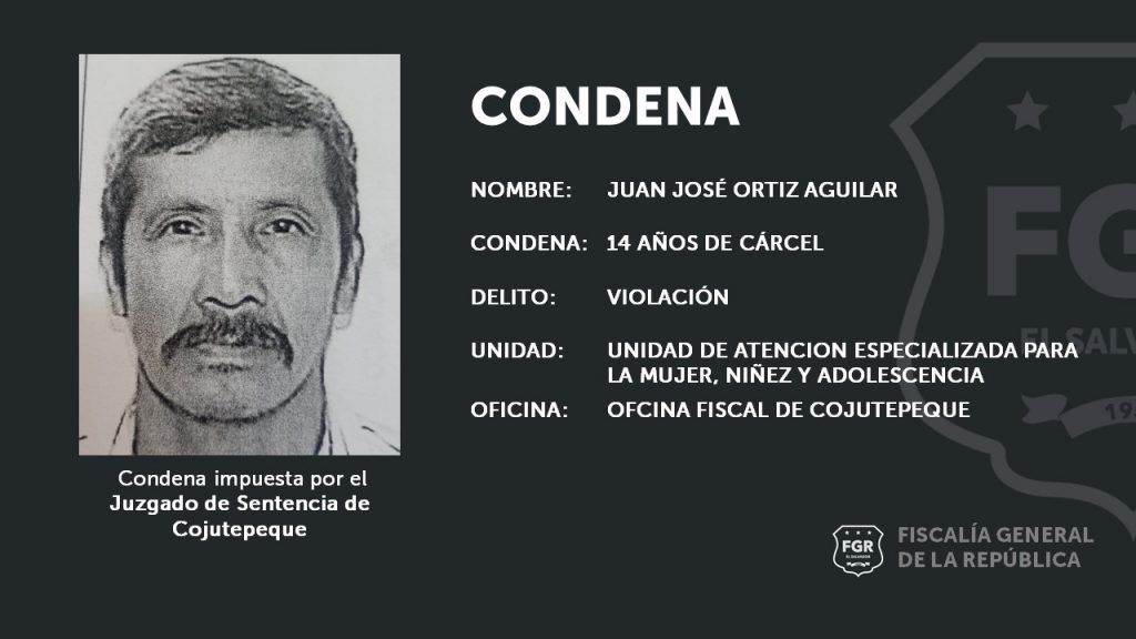 Cojutepeque. Juan José Ortiz Aguilar, de 64 años, fue condenado por el Juzgado de Sentencia de Cojutepeque a 14 años de prisión por el delito de violación en perjuicio de una menor de edad.
