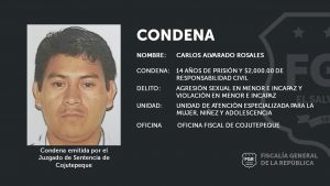 Cojutepeque, Cuscatlán. Carlos Alvarado Rosales aceptó voluntariamente que agredió sexualmente y violó a una menor de edad durante 3 años en San Pedro Perulapán, por lo que se le impuso una pena de cárcel de 14 años.