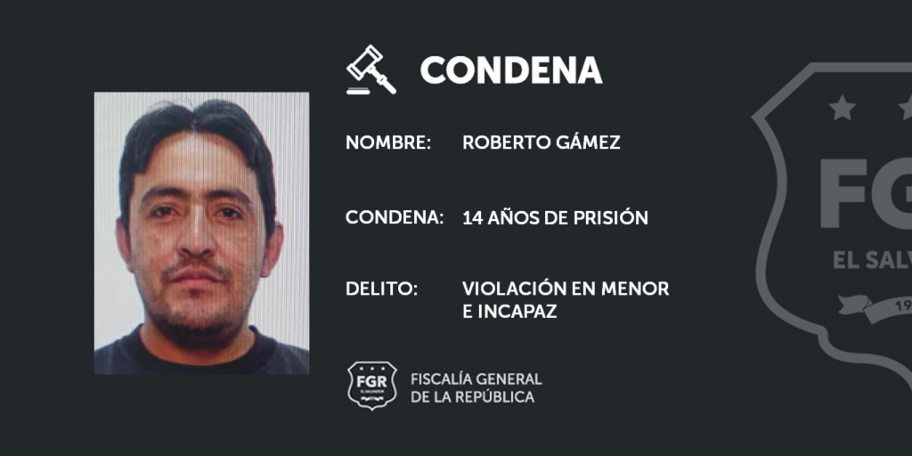Fiscales de La Unidad de Atención Especializada para la Mujer, Niñez, y Adolescencia, de la Oficina Fiscal de Santa Tecla, La Libertad, lograron que el Tribunal Primero Sentencia de esa ciudad, condenara a 14 años de Prisión a Roberto Gámez, por el delito de Violación en Menor e Incapaz.