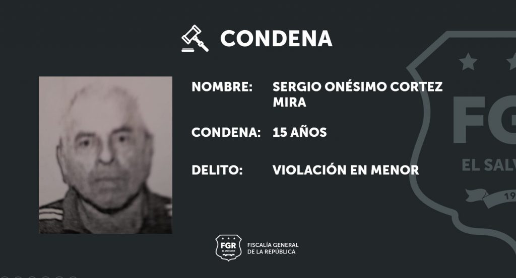 Ilobasco, Cabañas. Luego de dos días de juicio y en los cuales la Fiscalía presentó abundantes pruebas, se logró la condena de Sergio Onésimo Cortez Mira a 15 años de prisión por el delito de violación en menor o incapaz, modalidad continuada.