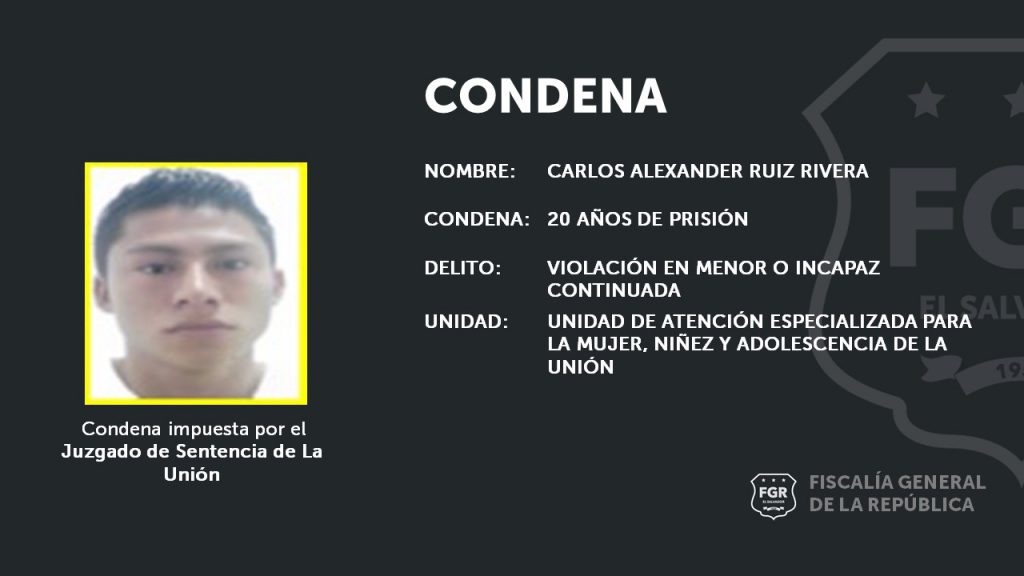 La Unión. Carlos Alexander Ruiz Rivera de 27 años estará en la prisión sus próximos 20 años por haber violado en varias ocasiones a un menor de edad, cuando tenía 12 años, afirmaron Fiscales de la Unidad de Atención Especializada para la Mujer, Niñez y Adolescencia de la oficina de La Unión.