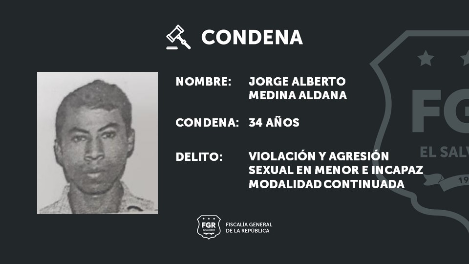 Santa Ana. La Fiscalía General de la República logró una condena de 34 años de prisión para Jorge Alberto Medina Aldana, a quien acusó de haber violado a un menor de edad durante once años. La Fiscalía comprobó en el juicio que el imputado inició con las agresiones al menor cuando este tenía seis años -en el 2010-, ambos vivían en la misma casa y se aprovechó de ello para abusar de él.