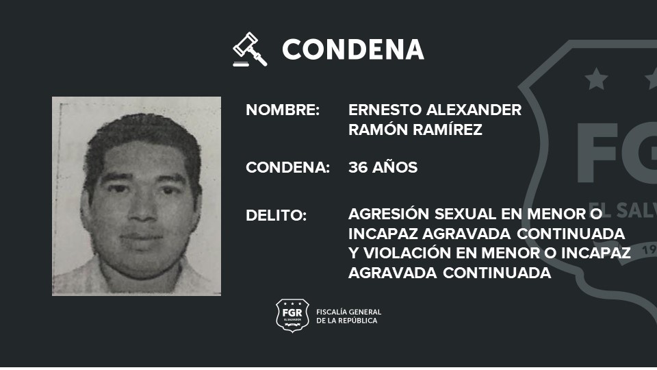 Santa Ana. Una vez más la Fiscalía hace justicia para una víctima de abusos sexuales, y logra que Ernesto Alexander Ramón Ramírez sea condenado a 36 años de cárcel por haber agredido y violado a una menor de edad durante ocho años.
