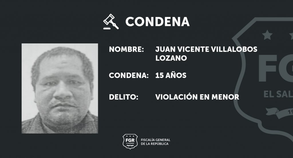 San Vicente. En tres días de juicio, fiscales lograron demostrar la culpabilidad de Juan Vicente Villalobos Lozano, por el delito de Violación en Menor. Villalobos Lozano, de 46 años de edad, fue condenado por el Tribunal de Sentencia de San Vicente a 15 años de cárcel por el ilícito en mención.
