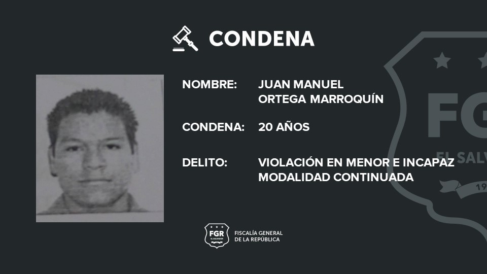 Sonsonate. La Fiscalía General de la República presentó todos los elementos probatorios necesarios para demostrar la culpabilidad de Juan Manuel Ortega Marroquín, quien cometió el delito de Violación en Menor e Incapaz en perjuicio de una menor de edad.