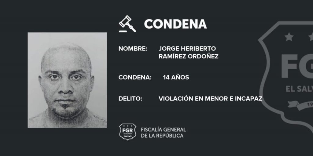 La Fiscalía General de lRepública aseguró una condena de 14 años de prisión para Jorge Heriberto Ramírez Ordoñez, a quien se le acusó de haber violado a un menor de edad el pasado 21 de marzo, en Sonsonate.