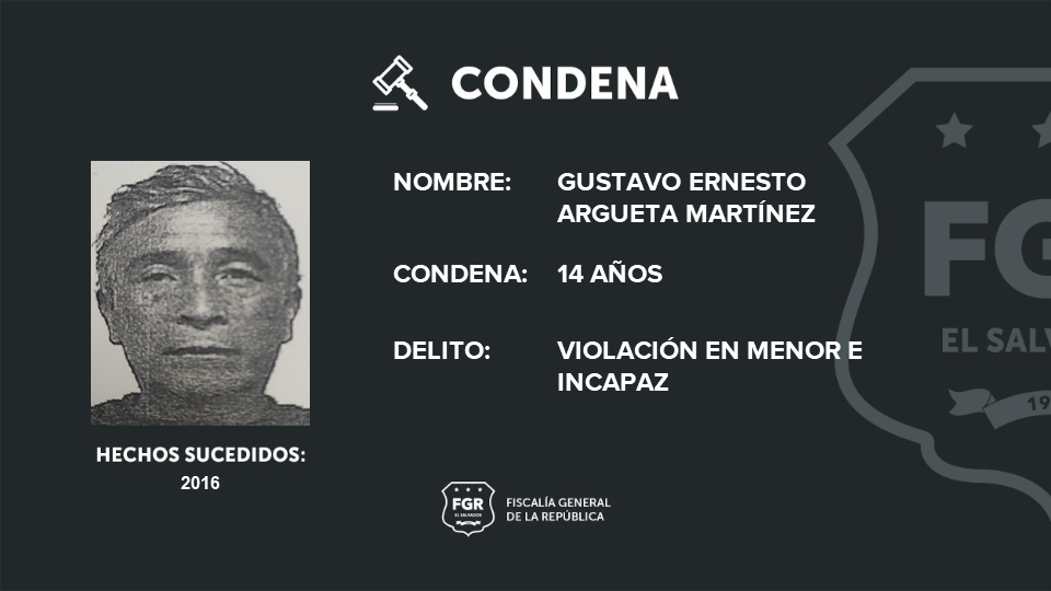Cuscatlán. Gustavo Ernesto Argueta Martínez fue sentenciado a 14 años de prisión por el delito de violación en menor e incapaz en perjuicio de una persona con discapacidad. La Fiscalía General de la República en su compromiso por la protección de los derechos de grupos vulnerables, consiguió un resultado favorable para hacer justicia.