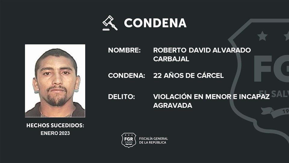 Chalatenango. A 22 años de cárcel fue condenado Roberto David Alvarado Carbajal por el delito de violación en menor e incapaz agravada; la víctima es una adolescente de 14 años de edad.