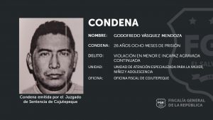 Cojutepeque. Una condena de 26 años con 8 meses, más el pago de US$27.000 de responsabilidad civil deberá pagar Godofredo Vásquez Mendoza, luego de resultar culpable de cometer el delito de Violación en Menor o Incapaz de forma continuada.