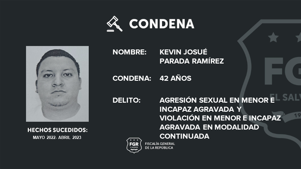 San Salvador. La Fiscalía General de la República (FGR) logró que Kevin Josué Parada Ramírez fuera sentenciado a 42 años de prisión por los delitos de agresión sexual en menor e incapaz agravada y violación en menor e incapaz agravada en modalidad continuada en perjuicio de un menor de edad.