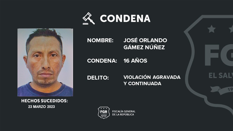 San Salvador. José Orlando Gámez Núñez ha sido sentenciado a cumplir condena de 16 años de prisión al ser declarado culpable por haber abusado sexualmente de una adolescente en la jurisdicción de Mejicanos, Salvador.