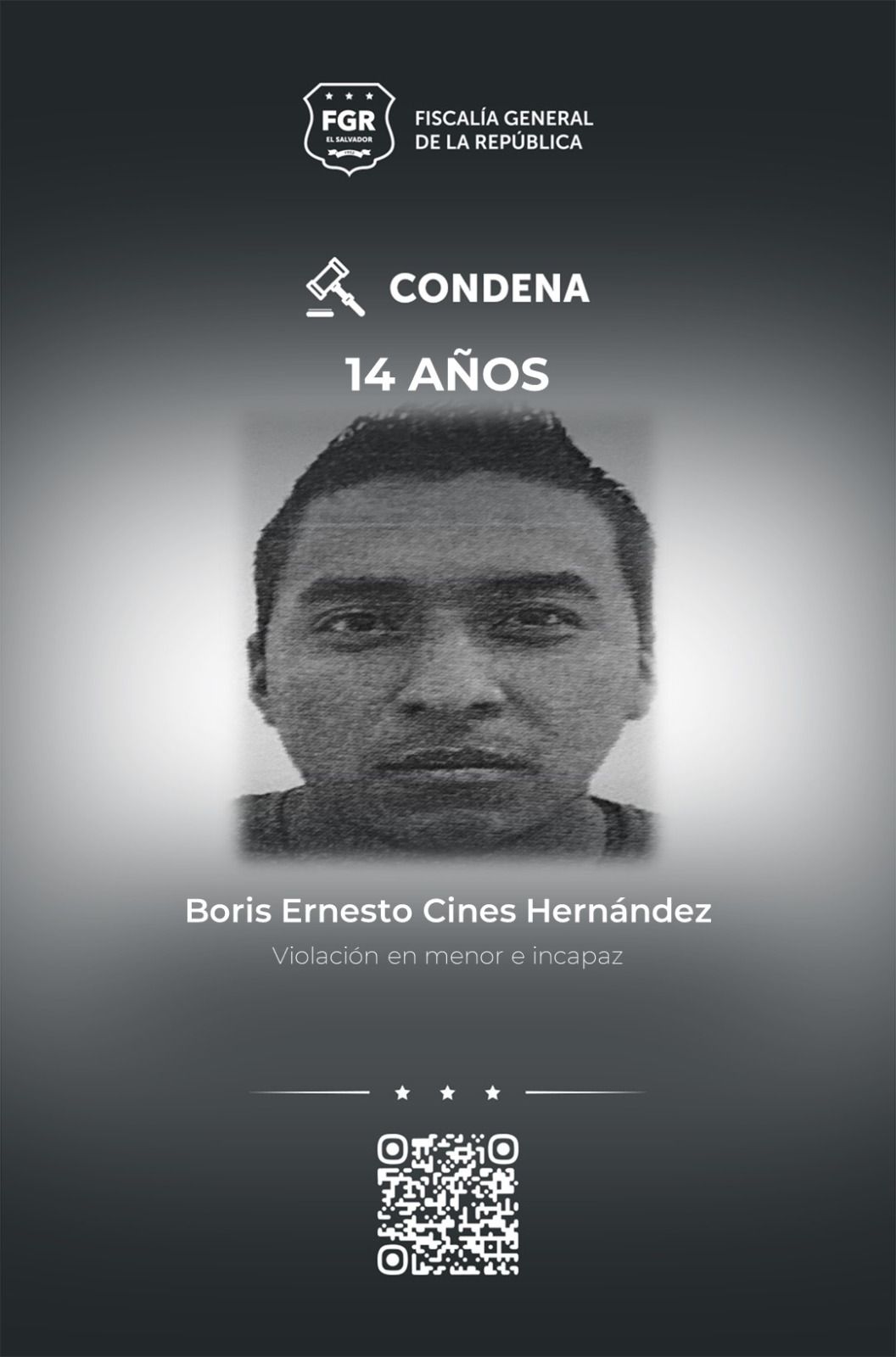La Libertad Este. La Fiscalía General de la República (FGR) logró 14 años de cárcel para Boris Ernesto Cines Hernández por haber violado a una menor de edad, durante febrero 2024 en Santa Tecla, La Libertad Sur.