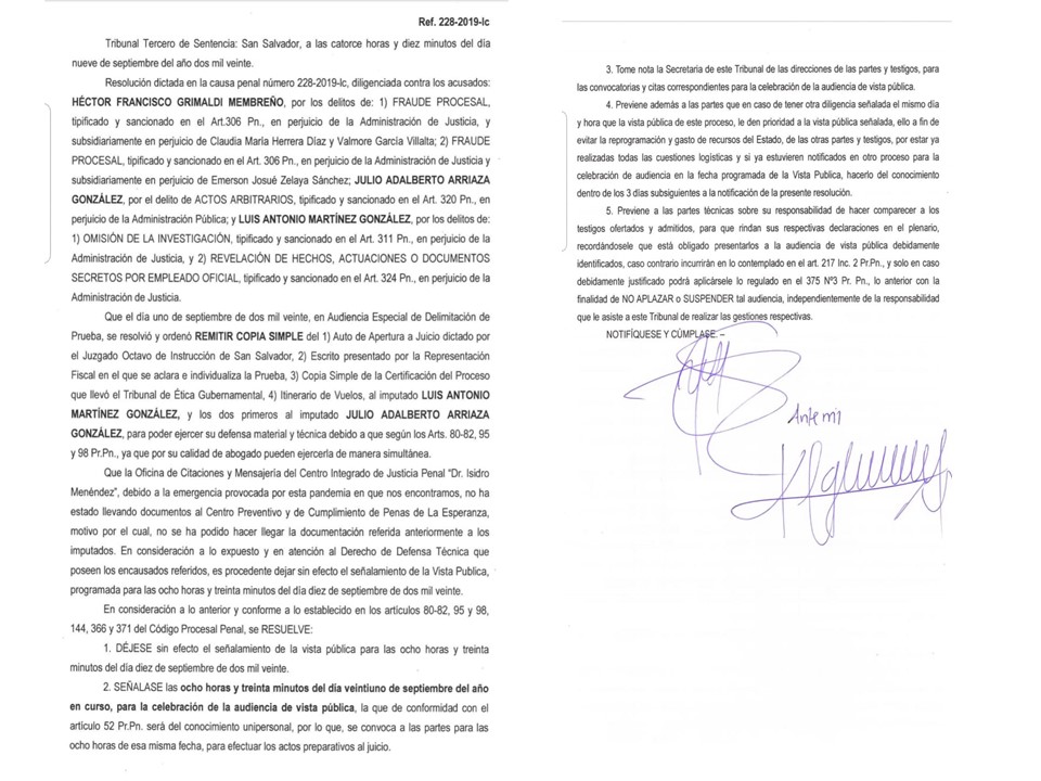 Para hoy se había previsto que iniciara el juicio contra Martínez González, así como contra el exdirector Julio Arriaza González y el abogado Héctor Grimaldi. Al exfiscal se le atribuyen los delitos de Omisión de la investigación y Revelación de hechos, actuaciones o documentos secretos por empleado oficial; Arriaza González, acusado por Actos arbitrarios y Grimaldi por Fraude Procesal.