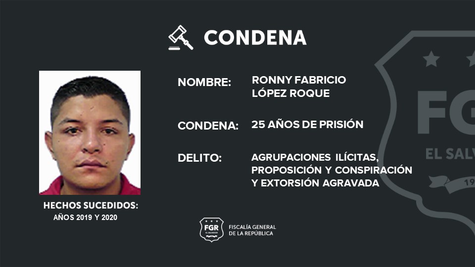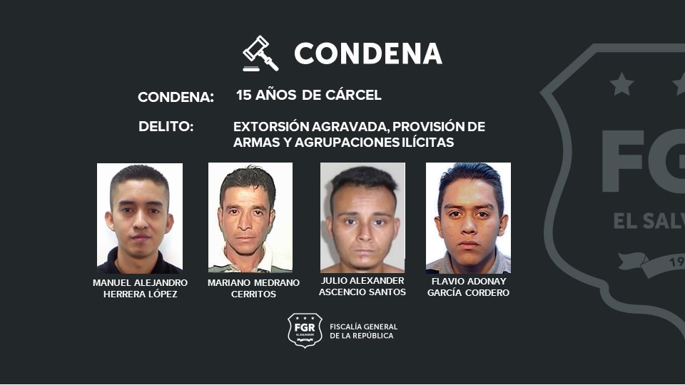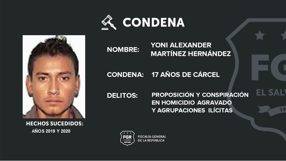 Yoni Alexander Martínez Hernández, alias “Yony”, purgará 17 años tras las rejas; el imputado tenía rango de soldado dentro de la estructura, al igual que Manuel Alejandro Herrera López, alias “zombi”; Mariano Medrano Cerritos, alias “Zurdo”; Julio Alexander Asencio Santos, alias “bombillo” y Flavio Adonay García Cordero, alias “nabo”, quienes fueron condenados a 15 años.