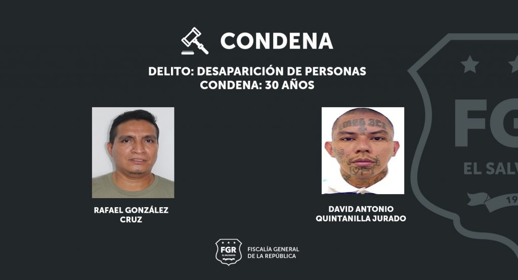 San Vicente. Dos peligrosos miembros de la Mara Salvatrucha, MS-13, fueron condenados a 30 años de prisión por el delito de desaparición de personas, en perjuicio de dos víctimas, gracias a las pruebas presentadas por los fiscales en el juicio.